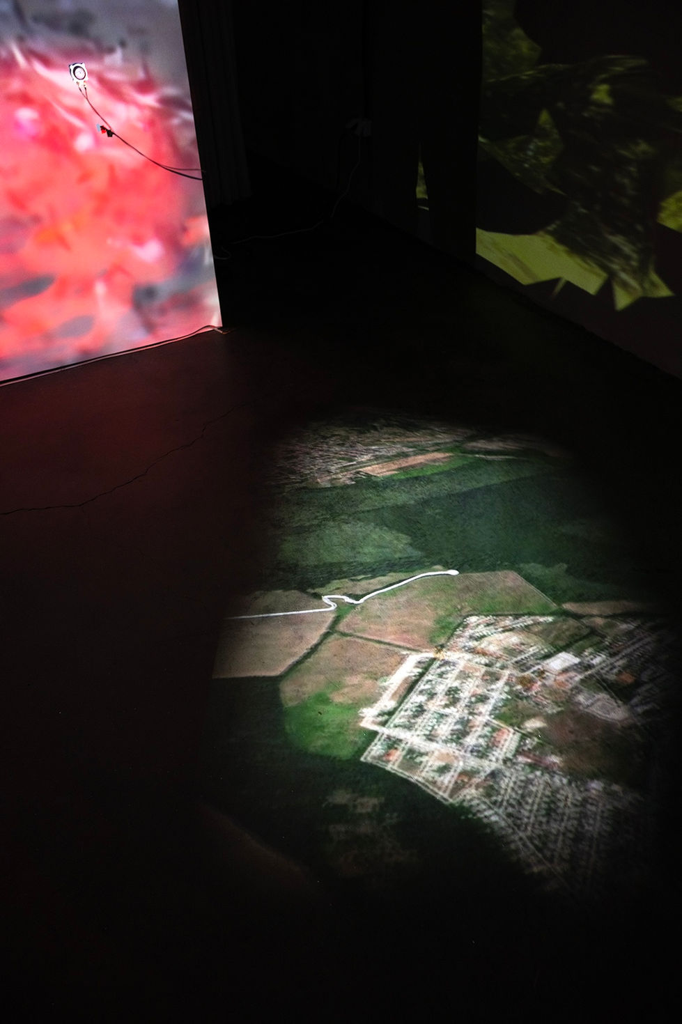 Visual and audio layers, 3D scans, thermal imagery, drone footage, and recordings of high-frequency waves, are presented in large-scale projections that respond to the viewer’s presence. The viewer’s shadow interrupts the image, becoming a metaphor for human impact and our inability to fully see or grasp nature. The work offers not comprehension, but a sensitive movement along the edge of the perceptible.